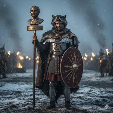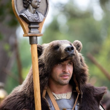 La piel de lobo o de oso: Tradicionalmente, los portadores de estandartes cubrían su casco y hombros con la piel de un depredador. Las patas delanteras se anudaban sobre el pecho (el nodus Herculaneus). Esto no era solo estética; era un vínculo con las raíces totémicas y arcaicas de Roma.