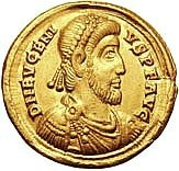 : Flavio Eugenio. 392-39AV Solido (4.44 g), zecca di Mediolanum (Milano), coniata nel 393-394. Creative Commons Attribution-Share Alike 2.5 Generic license.