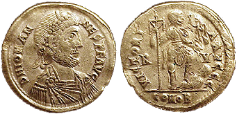 Solidus del usurpador/emperador Joannes. Menta de Rávena. D N IOHAN NES P F AVG, busto con diadeadas de roseta, drapeado y corrazizado a la derecha..Atribución: Classical Numismatic Group, Inc. http://www.cngcoins.com. Creative Commons Attribution-Share Alike 2.5 Generic.